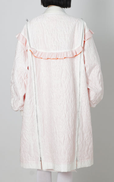 フロントにはラウンドしたヨーク切替に振りフリルを施しています。フリルは2枚仕立てで内側には裏地のオレンジを使用し、チラッとみえるオレンジがポイントになっています。